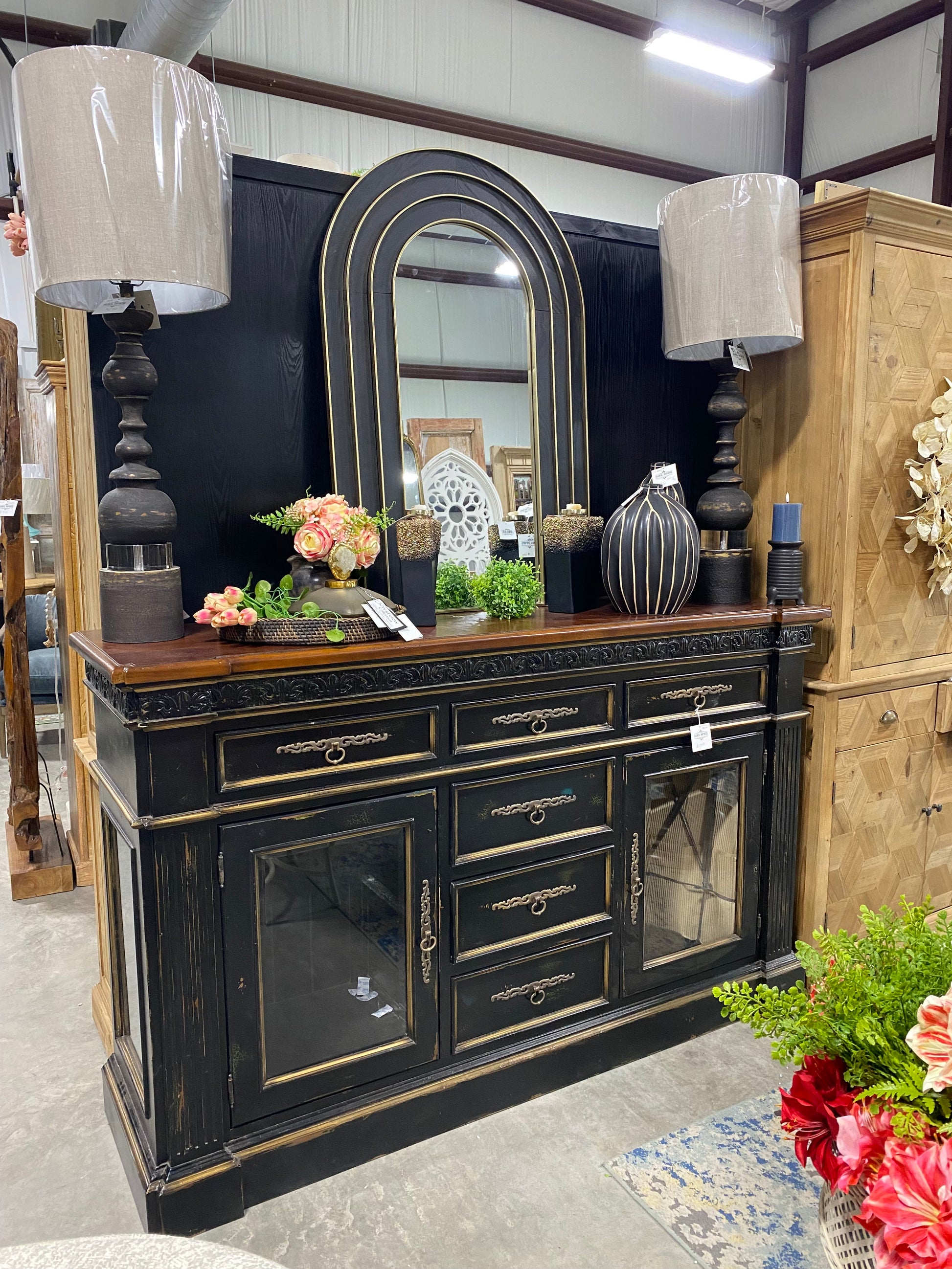 This black bordoux buffet is crafted from solid mahogany wood and features elegant gold trim and a natural mahogany top. The glass panel doors and side panes provide a sophisticated touch, while the interior glass/wood shelves and 6 drawers offer ample storage space. Add a touch of sophistication to your dining room with this high-quality piece.