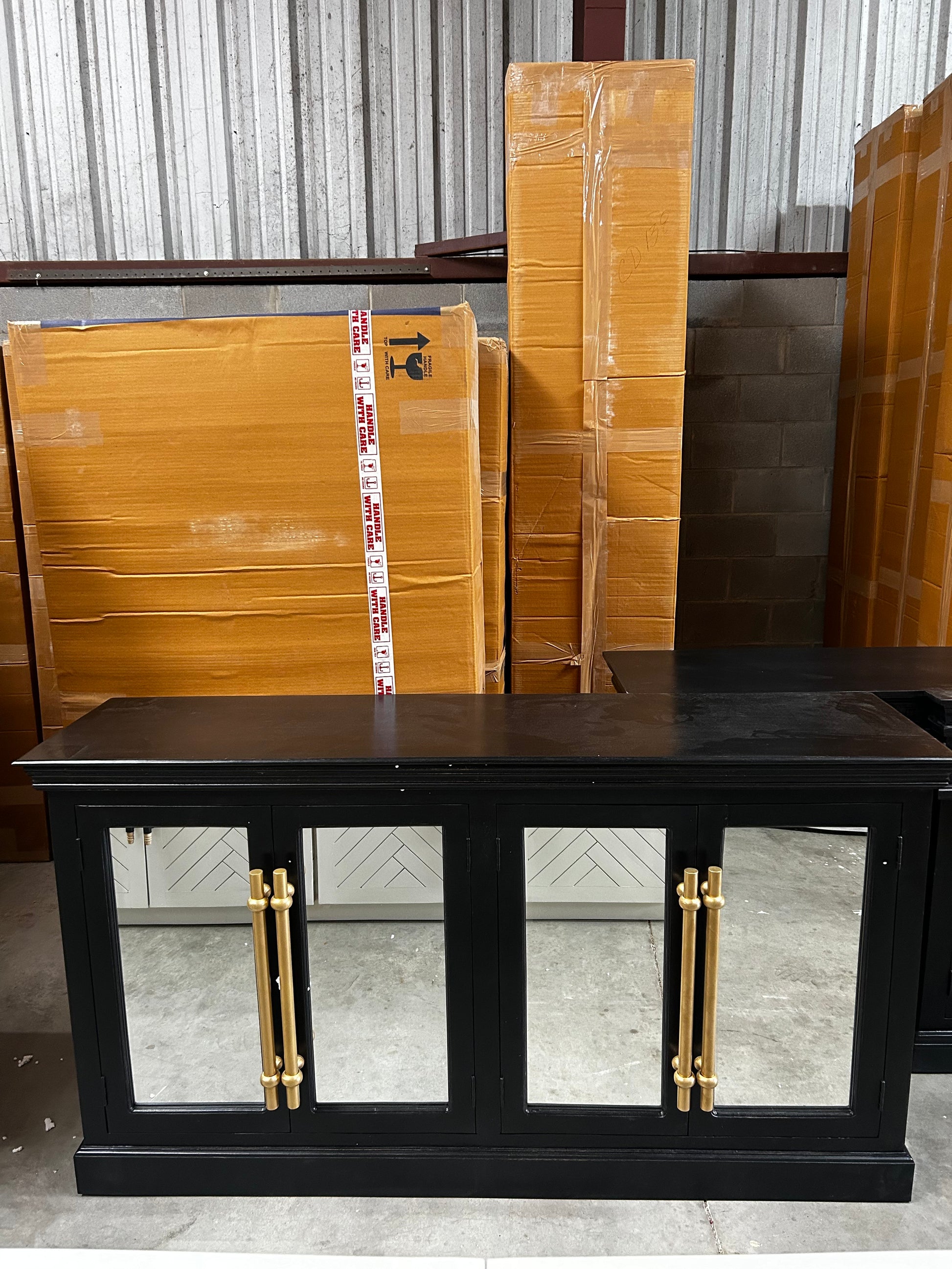 Upgrade your home decor with our R1 sideboard. Crafted from durable black mango wood, this modern piece features a mirrored front that adds a touch of elegance. The large gold handles provide functionality and style. Transform your space with this sleek and sophisticated addition.