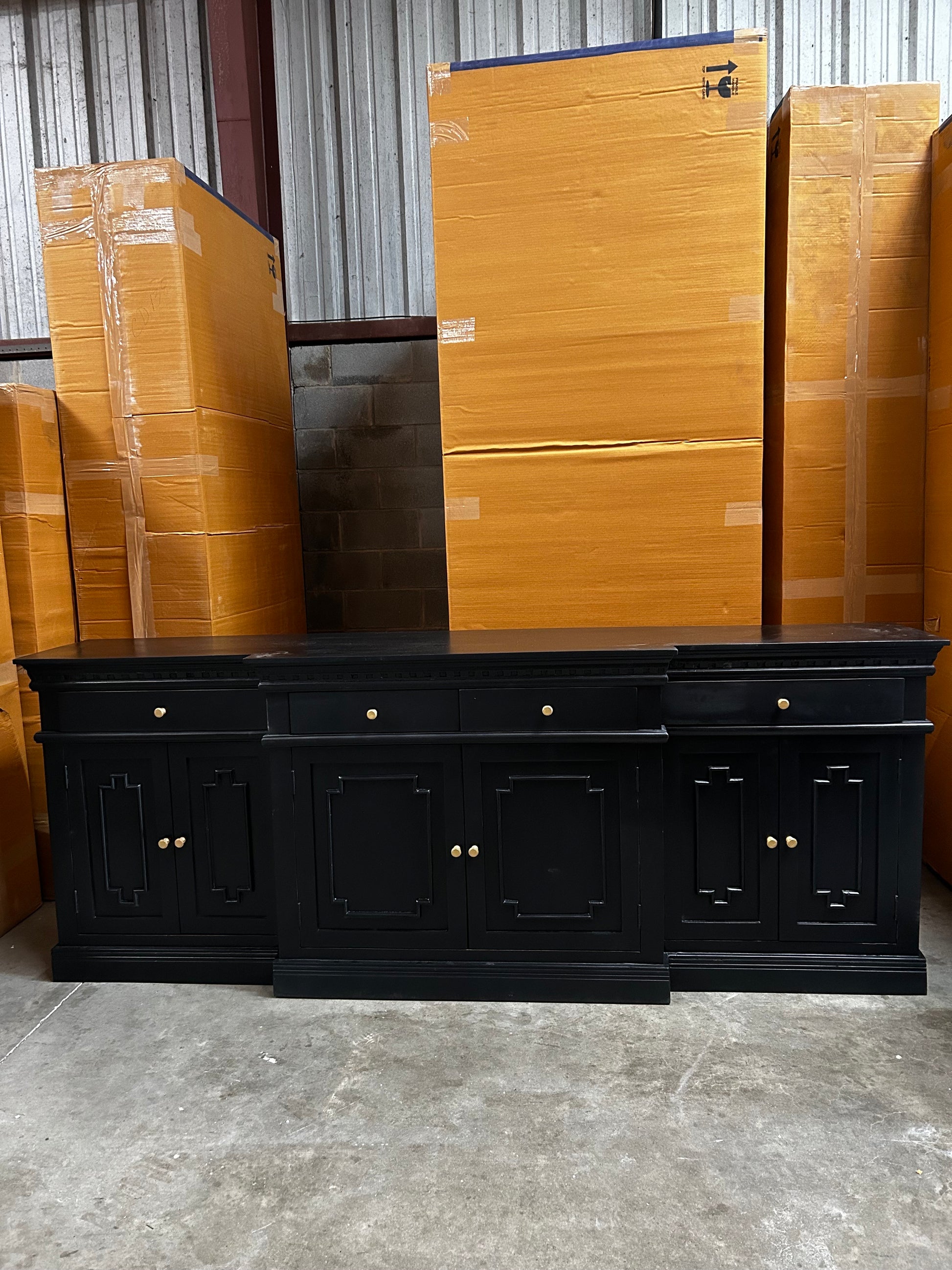 The R20-A black buffet boasts a spacious 104 inch design with 6 doors and 4 drawers, all expertly crafted from sleek black mango wood. The elegant gold hardware adds a touch of sophistication, making this buffet a stylish and functional addition to any dining room.