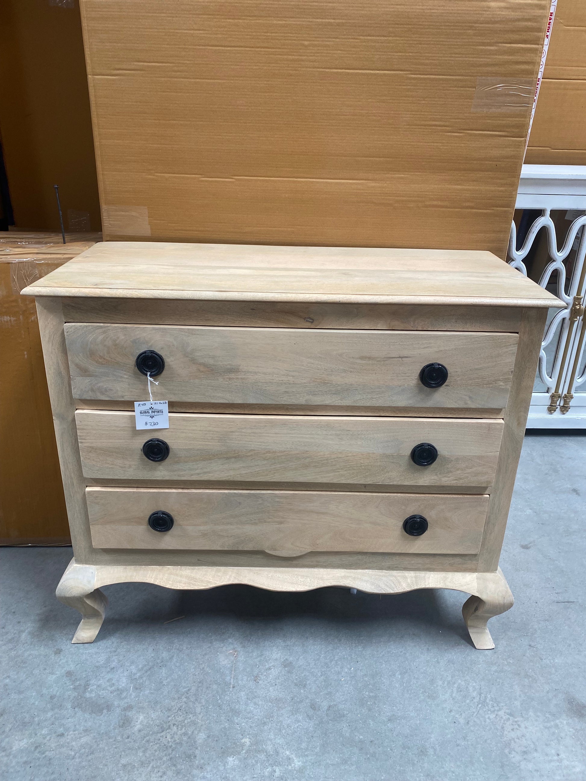 Experience the beauty and warmth of natural light mango wood with our R43 chester drawer. With 3 spacious drawers and French style legs, this piece is as functional as it is stylish. Complete with black hardware, it's the perfect addition to any home.