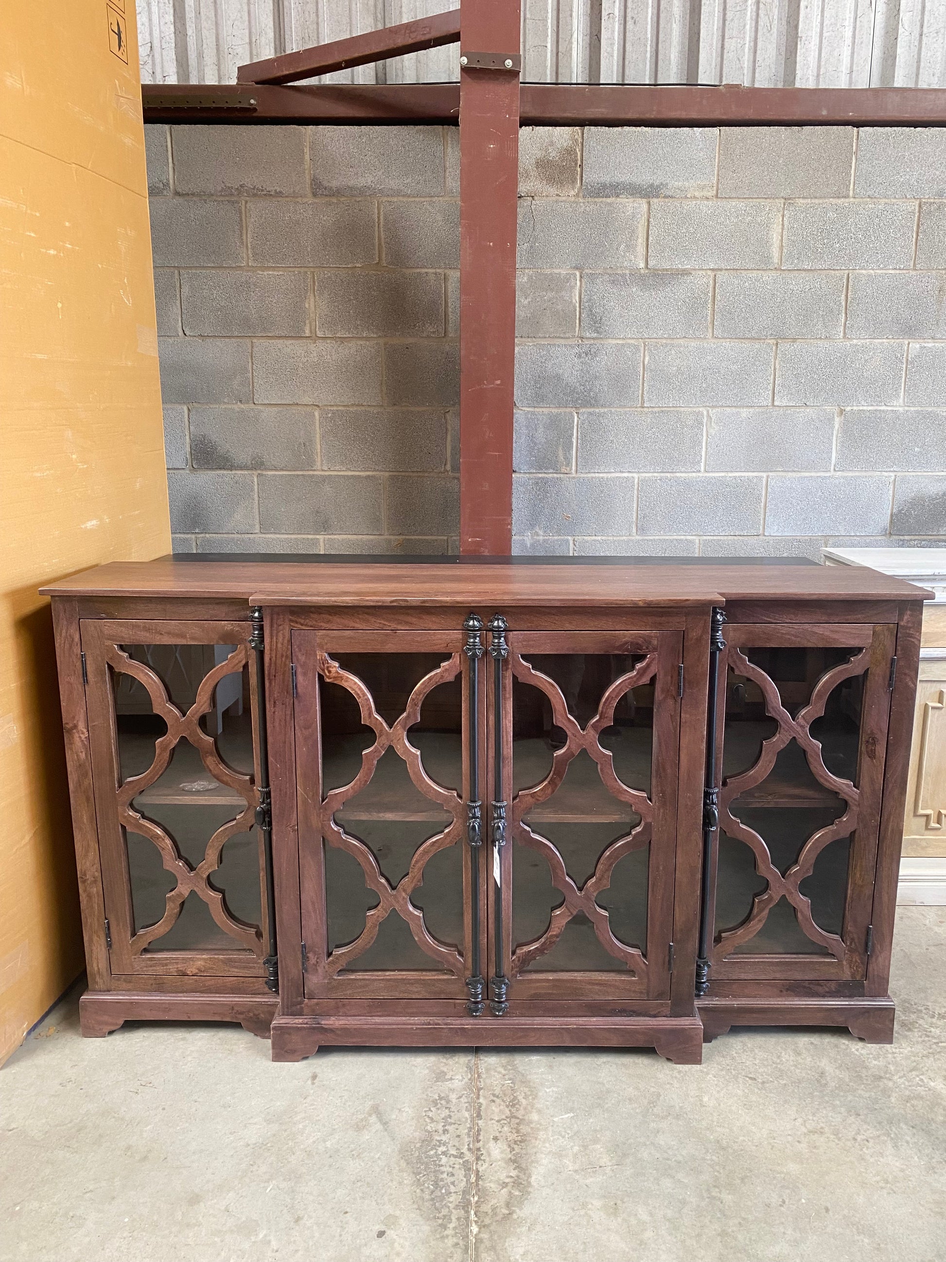 The SK69 is a luxurious brown mango sideboard, boasting four decorative glass doors adorned with a stunning wood design. Enhanced with sleek black hardware, this piece exudes elegance and sophistication. Experience the perfect blend of functionality and style with its breakfront look.